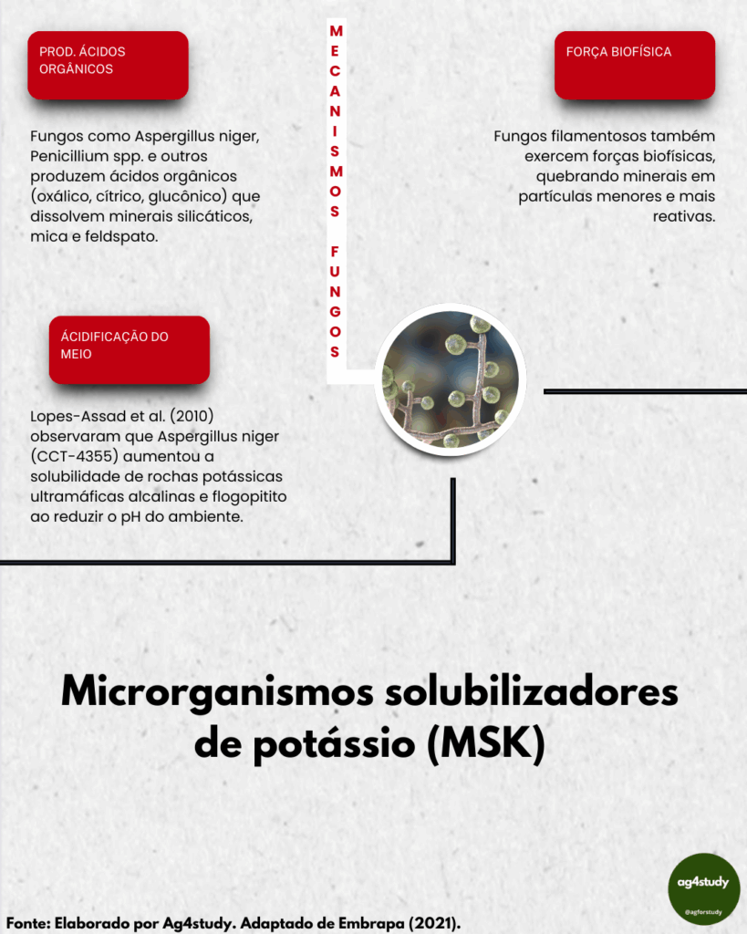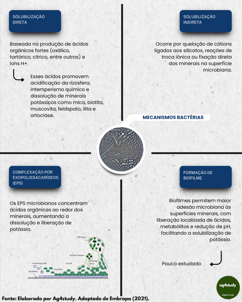 espécies Acidothiobacillus ferrooxidans, Paenibacillus spp., P. mucilaginosus, P. frequentans, P. glucanolyticus, Bacillus mucilaginosus, B. edaphicus, B. circulans, Arthrobacter sp., Enterobacter